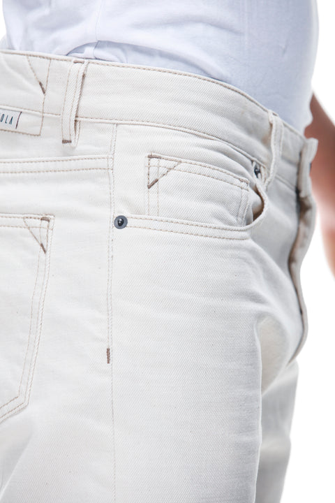 The comfortable and extremely versatile 5-pocket denim for men, proposed in the Ecru Denim variant. Garment with a lively and sophisticated touch in your wardrobe, wearable all year round thanks to the comfort and medium weight of the main fabric.