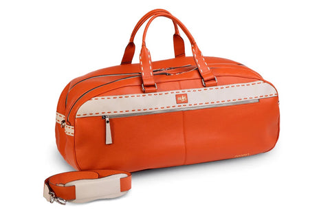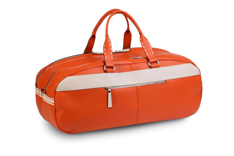 The BeeTennis Siena bag is a young, sporty and elegant bag designed for tennis and paddle but also for sport in general. It is handcrafted in Italy in genuine orange / beige leather with quality materials and an elegant and modern design. It is a resistant and capacious tennis bag, it can contain up to 4 rackets and much more. It has 2 large central compartments, one of which is made with shockproof isothermal material lined to protect rackets or other technical material during transport. It is ideal for taking it to the office, the gym, the tennis court without having to carry a second sports bag. Elegant and multi-functional, it is the only tennis bag that combines sport and daily needs.
