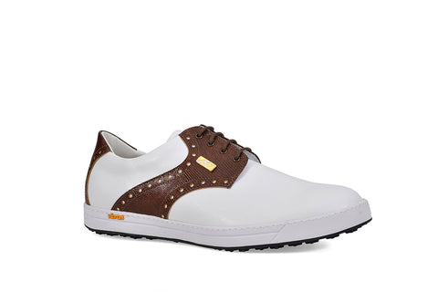 These golf shoes are made of internale ed external upper in water-repelent genuine leather, removable insole in ultrasoft aloe vera material with antibaterical certificate and covered in leather