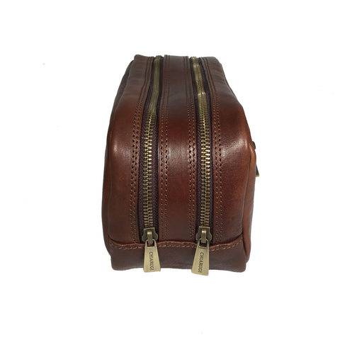 CAPACIOUS TOILETRY BAG CLOSED WITH DOUBLE ZIPPER ON TOP AND SIDE POCKET CLOSED WITH ZIP. Material: FULL GRAIN ITALIAN VEGETABLE TANNED COW LEATHER PAINT BY HANDLE USING PURE ANILINE . POLYESTER AND COTTON INSIDE LINING. OLD BRASS FITTING