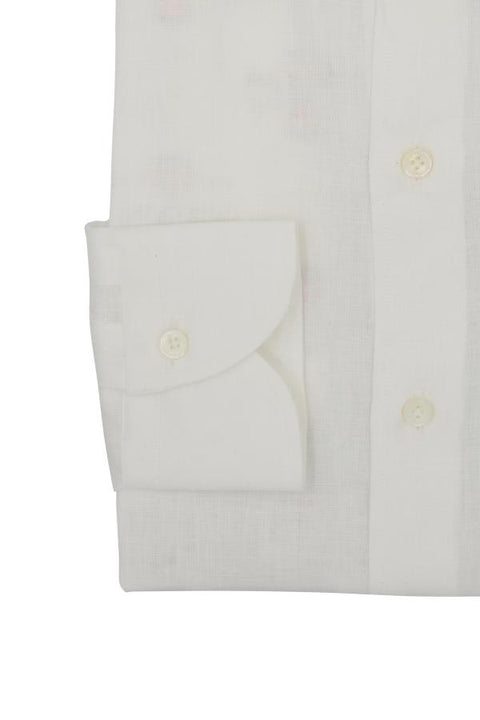 White Linen Shirt is a linen shirt, handmade in Italy, with a tailored pattern the shifted sleeve and embellished with a mother-of-pearl button and hand-finished buttonholes.