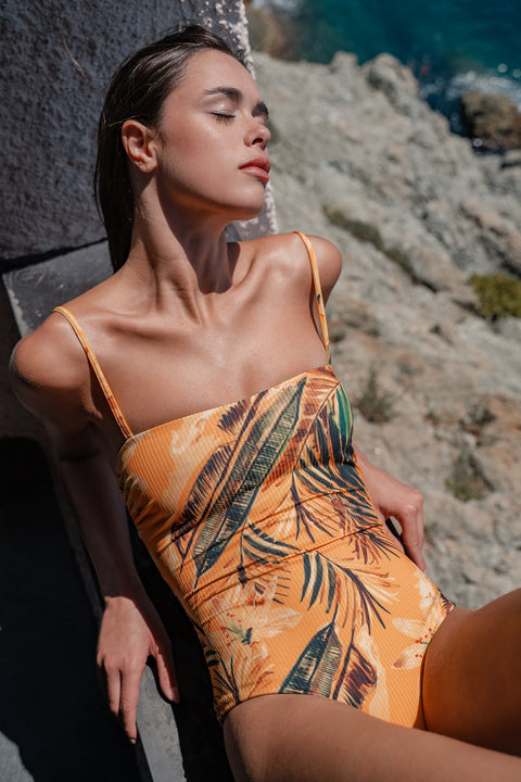 Printed one piece swimsuit made with GRS certified fabric. The square cut fits every size and the straps helps its fit. Made in Italy with a ribbed stretch fabric, it is available in pink, green and yellow jungle design.