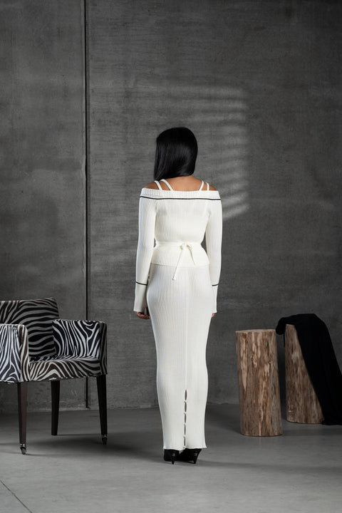 Ribbed high-waist long skirt with pearl detail on the back. Composition: 100% extrafine merino wool.
