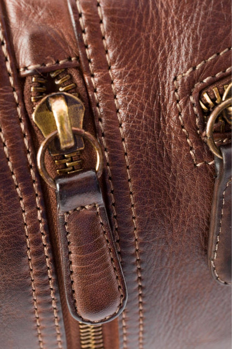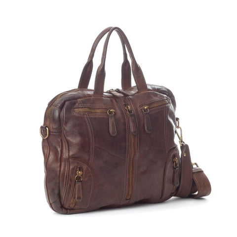 Unisex vintage handbag made of soft calf washed leather, artistically dyed using a unique three-dimensional colouring process, Made in Italy. Zip closure, double handle, front and back zip pockets, inside pockets and zip pocket, with adjustable shoulder strap.