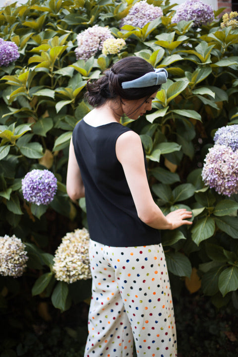 Precious 100% silk blouse, made of crepe satin and crepe de chine. Without sleeve and round wide neckline. Soft fit. It can be reproduced in other fabrics on request, according to availability in the atelier.