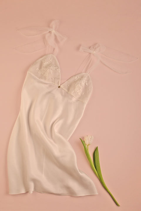 Viscose petticoat with french lace on the breast, doubled in silk chiffon. Adjustable shoulder straps with silk touch tulle bows. Detail of pendant with ginkgo leaf in gold plating on the center front. Length above the knee, about 85 cm. Elastic on the back. Color Silk white. One size. Available on other colors on request.