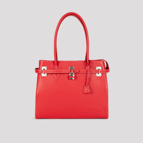 The Cattolica bag is a top bag with a distinctive and refined design. Its rigid structure with square lines makes it perfect for storing objects of different sizes. Expertly crafted in textured leather, with the iconic accessories, a key and a padlock, make this bag perfect for your every day. Available in: leather, black, olive, red, dark brown.