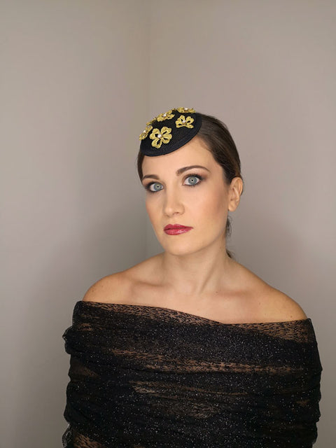 Black sisal drop with gold crochet flower embroidery and crystal bezel - base clip