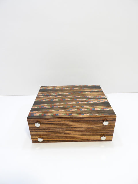Bauletto intarsiato in Legno rivestito di sfoglie in multilaminato e zebrano. Maniglia in metallo cromato, con chiusura a moschettone.