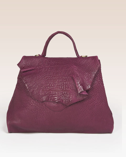 Its characteristic shape with an irregular flap and raw cut hides a magnetic closure inside.