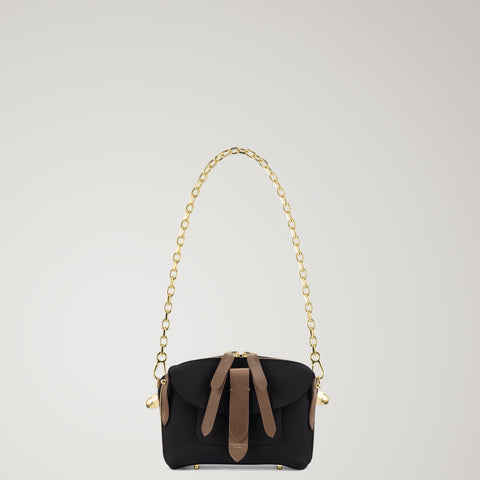 Made of soft tumbled calfskin, unlined interior, brass chain with gold finish, adjustable removable shoulder strap in leather and metals with gold finish.