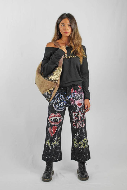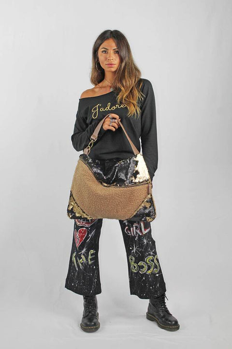 One-shoulder shopper with maxi asymmetric zip and real leather in bouclé fabric and reversible sequins, customized contrasting inner lining with double leather cell phone pocket and zip pocket, metals in aged brass.