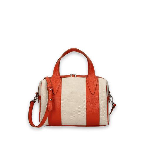 Small case made of canvas with natural armor tone on tone, leather trims in grain dollar contrasting color. Closed with zip. Cotton lining with zipped pocket. Adjustable leather shoulder strap.