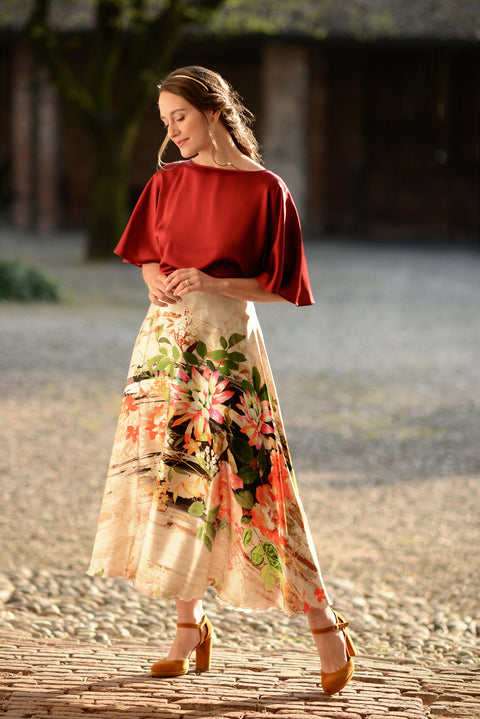 Precious 100% silk blouse, made of satin crepe and crepe de chine. Bell sleeve and boat neckline. Soft fit. It can be reproduced in other fabrics on request, according to availability in the atelier.